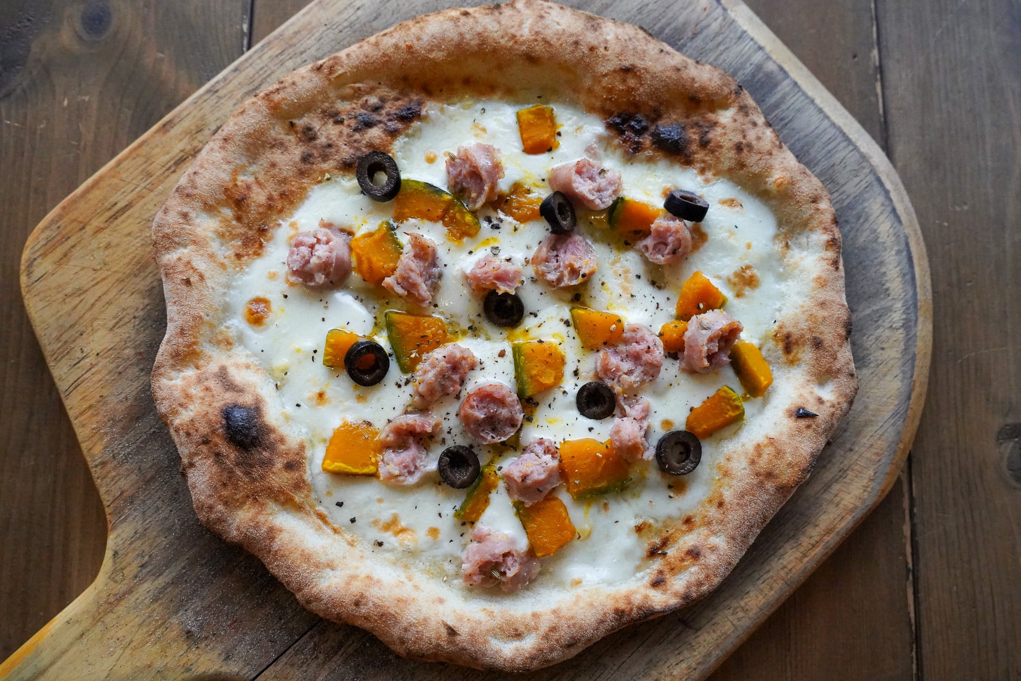 たっぷりマリボーチーズに、三種町産カボチャをふんだんに使い、そこに三種町のかわい農場さんから作っていただいた当店特製のサルシッチャを贅沢に乗せた季節限定のピッツァです。